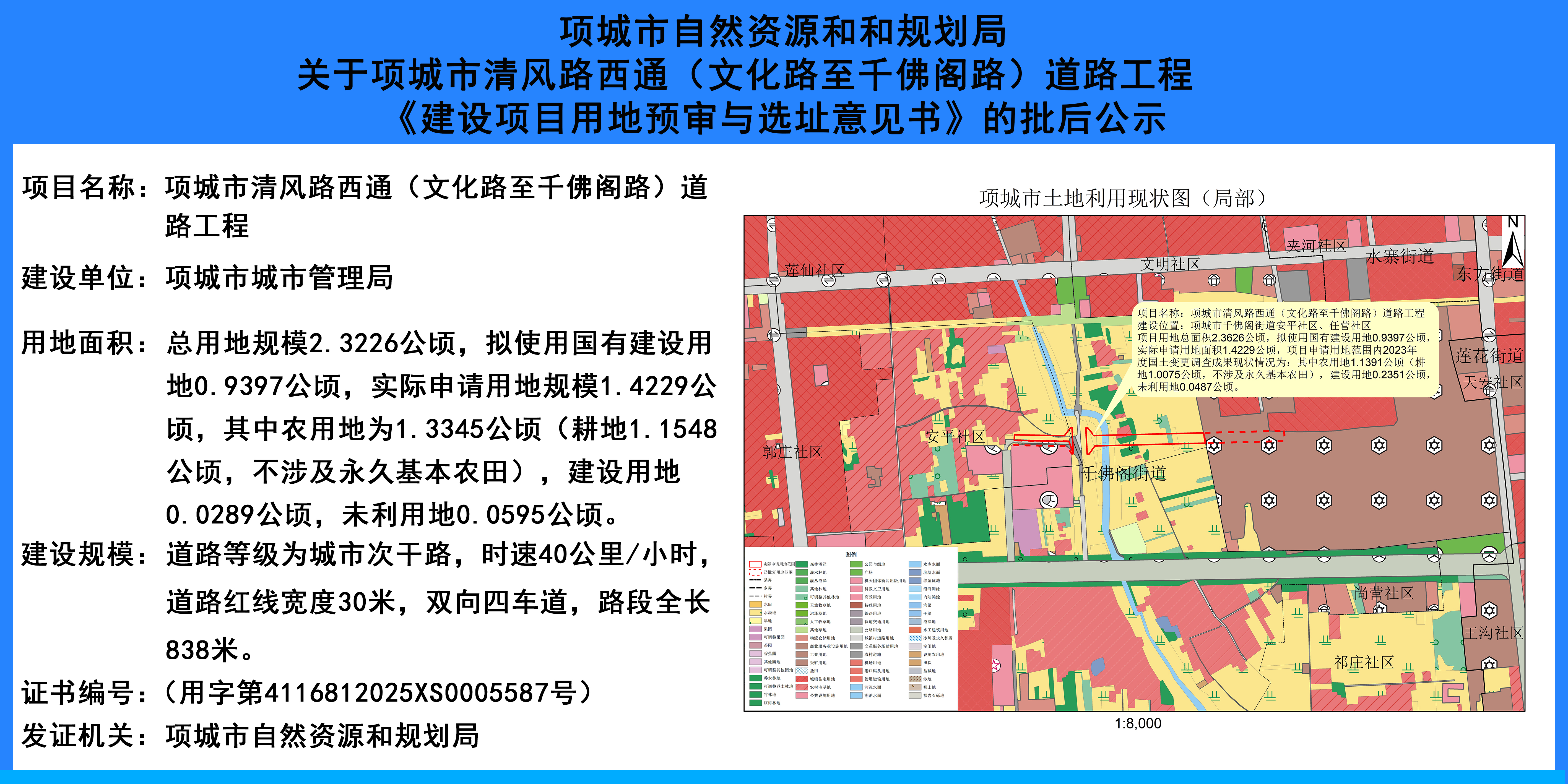 关于项城市清风路西通(文化路至千佛阁路)道路工程《建设项目用地预审与选址意见书》的批后公示