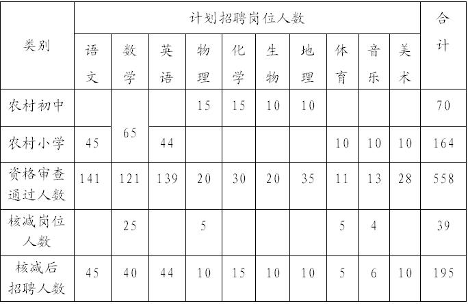 根据《项城市公开招聘农村中小学教师公告》,对报名结束后资格审查合格人数达不到规定比例的岗位进行核减。现将核减后的招聘岗位人数公告如下(详见下表):