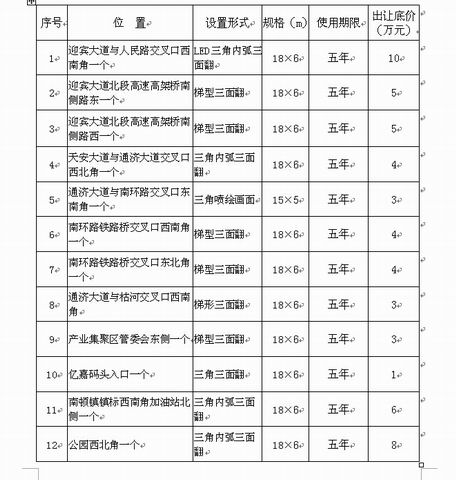 为加强户外广告设置管理,规范户外广告位置使用权,结合我市实际,按照整体规划、市场化运作,公开、公平、公正的原则对一期12个户外广告位使用权进行公开出让,现公告如下: