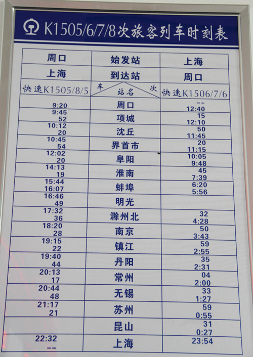 周口至上海K1505/6/7/8次列车时刻表