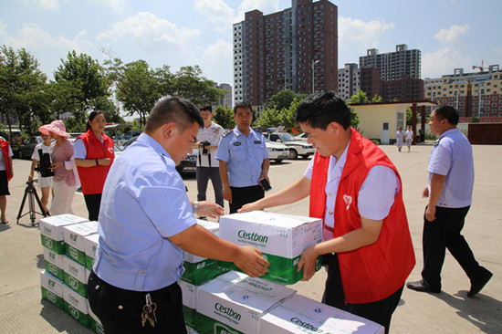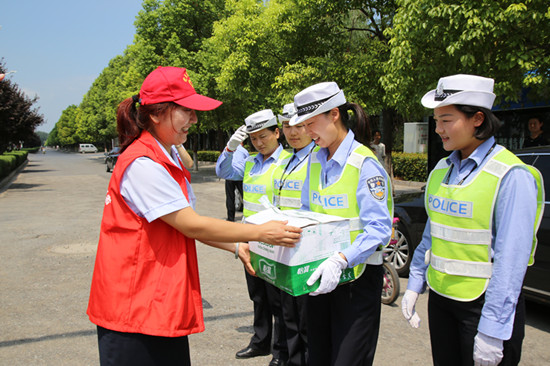 本网讯 7月28日上午,为感谢全市交通民警、交通协管员战高温、顶酷暑奋战在路面维护良好交通秩序,市国税局慰问人员一行来到市交警大队、三高女子岗等地,亲切慰问炎炎烈日下指挥交通的一线执勤民警、交通协管员,并送上防暑降温物品。