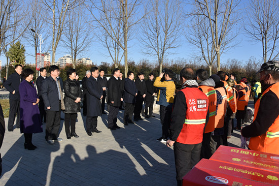 在驸马沟公园,王富生与环卫工人们亲切握手,对环卫工人起早贪黑,顶风冒雨,不畏严寒,辛勤工作,为创造优美、舒适、洁净的市容环境所付出的辛勤劳动表示衷心的感谢!市人大常委会主任刘体峰说,过去的一年,全市环卫工人不辞辛劳,为保持城市的美丽、干净、整洁作出了贡献,以自己的实际行动铸就了爱岗敬业、争创一流、艰苦奋斗、甘于奉献的高尚品格。春节期间,你们放弃了休息,坚持工作,当前,城区人流车流激增,保洁任务更加繁重,你们的工作量会更大,希望大家在节日期间坚守岗位,为美化项城再做贡献。