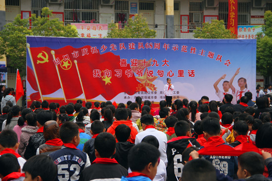 队会上,《红领巾飘起来》音乐响起,大队辅导员宣布新队员名单,老队员为新队员佩戴红领巾,并同时宣入队誓词,行队礼,唱队歌。随后,新队员代表以“喜迎十九大,我向习爷爷说句心里话”为主题,用生动的语言抒发了对中国共产党的拥护和爱戴,充分表达了对伟大祖国的热爱之情。(张纪友)