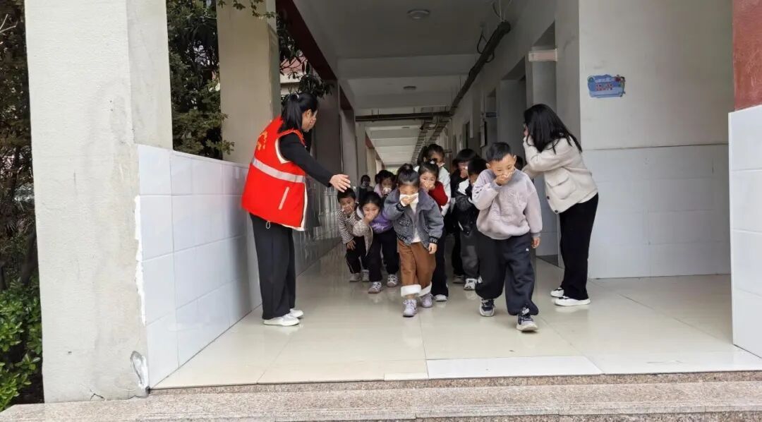 随着急促的警报声响起,消防演练正式启动。班主任第一时间组织学生做好防护,随即引导大家用湿毛巾捂住口鼻、弯腰低姿,沿预定路线快速有序撤离教学楼。与此同时,各岗位教师坚守楼梯口、拐角处等关键位置,全程引导学生疏散,避免拥挤、踩踏,切实保障学生安全。待全体师生安全抵达集结点后,各班班主任立即清点人数、逐级上报,确保无一人遗漏,整个撤离过程紧张有序、高效顺畅。