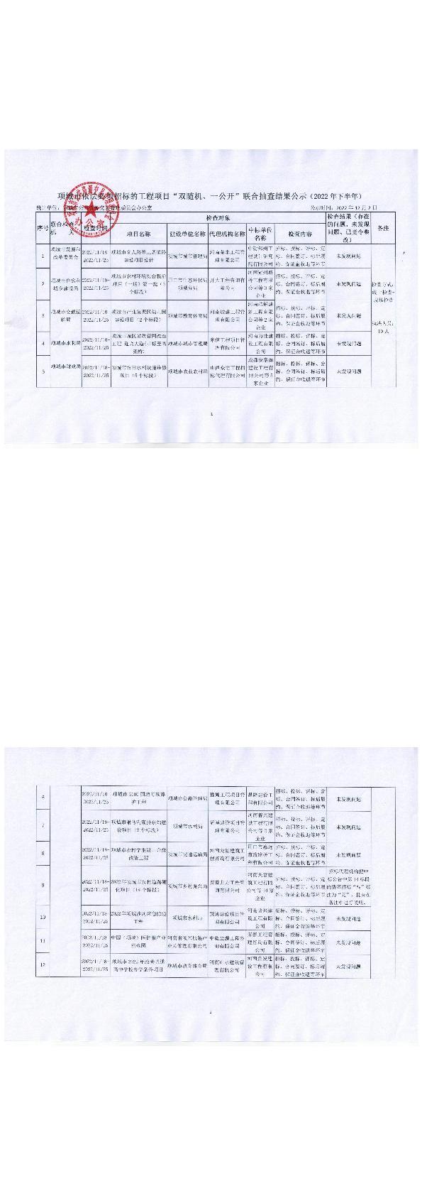 项城市依法必须招标的工程项目“双随机、一公开”联合抽查结果公示