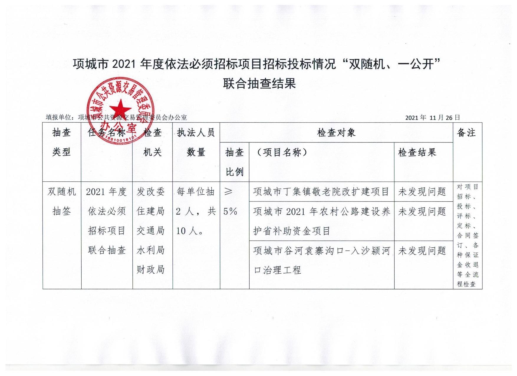 项城市2021年依法必须招标项目“双随机、一公开”联合抽查结果公开
