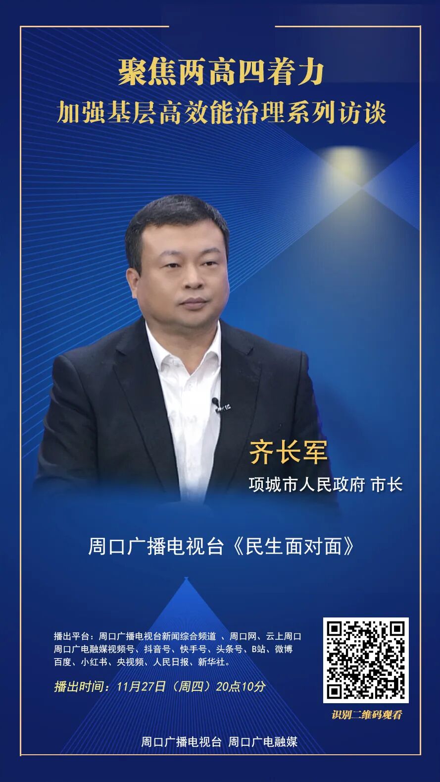 近年来,项城市锚定 “两高四着力” 战略方向,以 “工业强市” 为引领、以民生福祉为根本,持续推动经济社会高质量发展。“3+3+3” 现代产业体系激活产业集群活力,新型城镇化建设提升城市品质,民生实事精准落地惠及群众生活,每一处的变化都让 “宜业” 与 “宜居” 深度融合,让现代化新项城的轮廓越来越清晰、成色越来越亮眼。由周口广播电视台主办的大型电视直播访谈节目《民生面对面》聚焦“两高四着力” 加强基层高效能治理系列访谈——项城篇,将于11月27日(周四)20:10在周口广播电视台新闻综合频道播出。本期节目将邀请项城市人民政府市长齐长军做客直播间,就项城市产业升级、农业发展、民生改善等方面问题与大家交流。