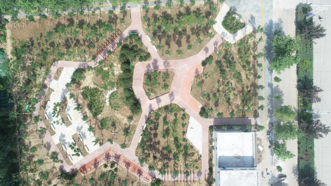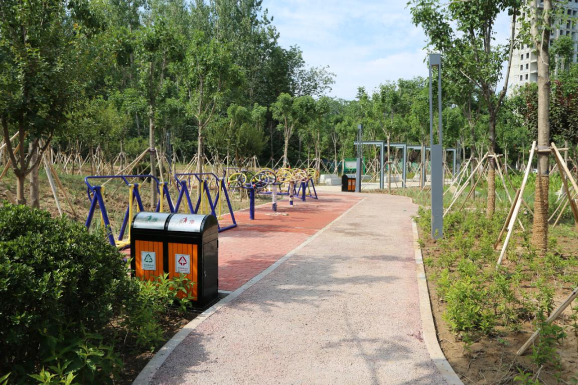 该游园占地0.63hm 2 ,位于人民路与商城路交叉口,2019年1月开工建设,6月竣工并投入使用。由河南农大风景园林规划设计院设计,乔灌花草球配置合理,绿化层次分明,园内建有公厕、园路广场、廊架等,设有健身器材、休闲座椅等设施,服务功能完善。